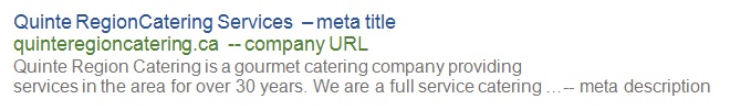 Search results display the text that you specify in your meta title and meta description tag. However, since the amount of text being displayed is limited and restricted, you cannot choose what to show when someone searches for specific keywords. For example, if someone searches “catering Prince Edward County”, your Organic Search result will show as: