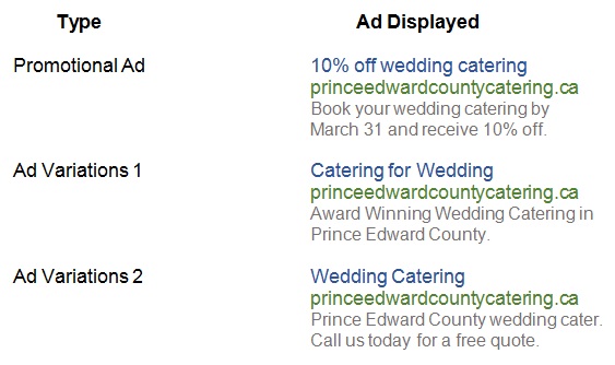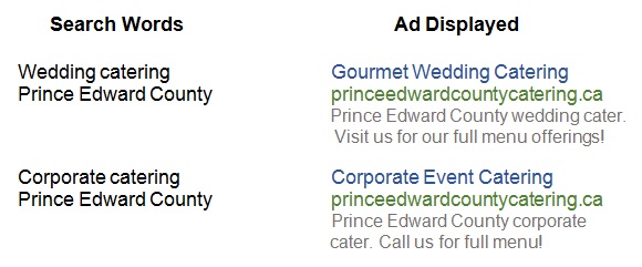 With pay-per-click ads, you can control and customize different ads to be displayed when certain keywords are searched. For instance, Prince Edward County Catering set up two different ads, one to promote wedding catering and the other for corporate events catering. Your ad will appear as follows for each search result: