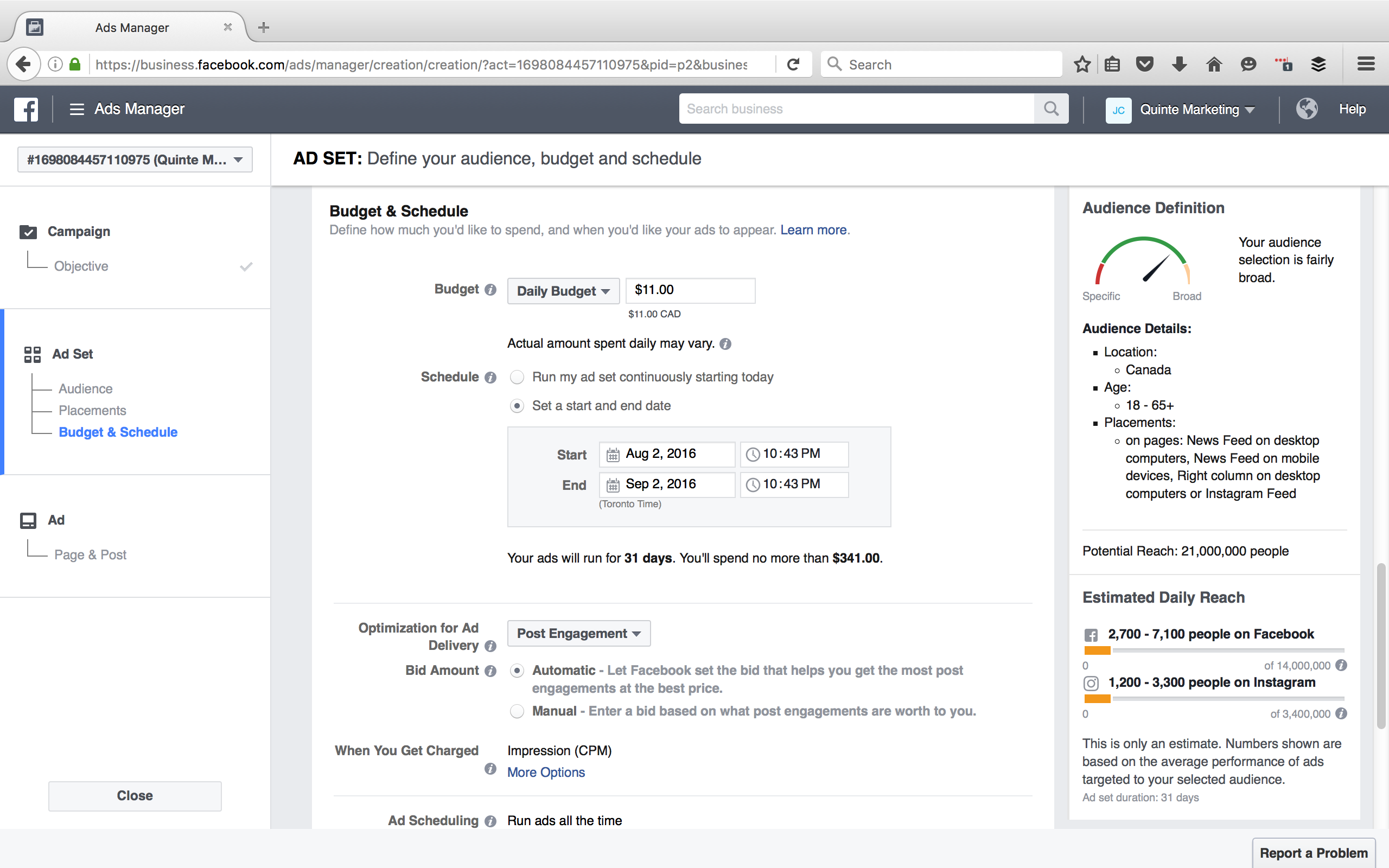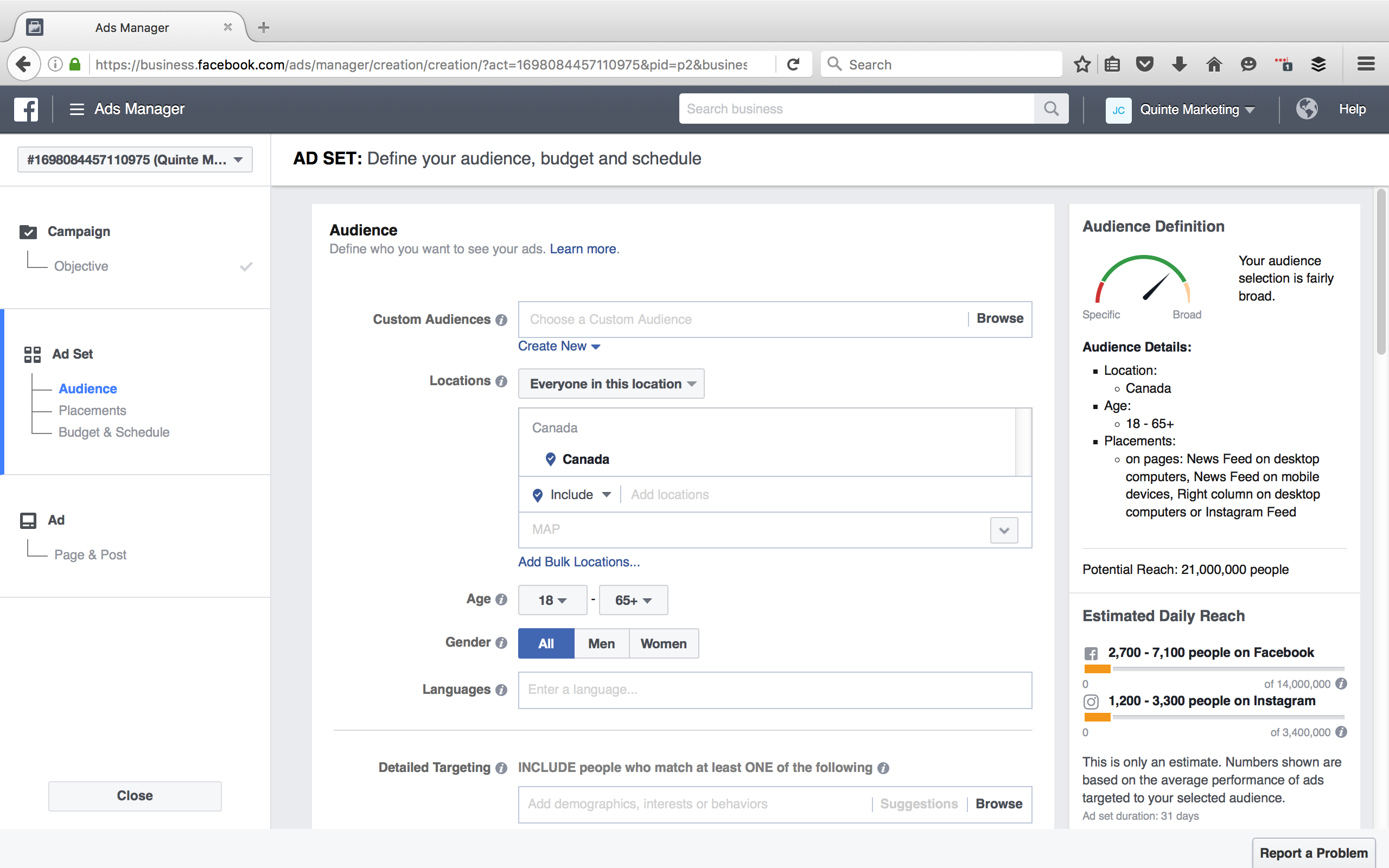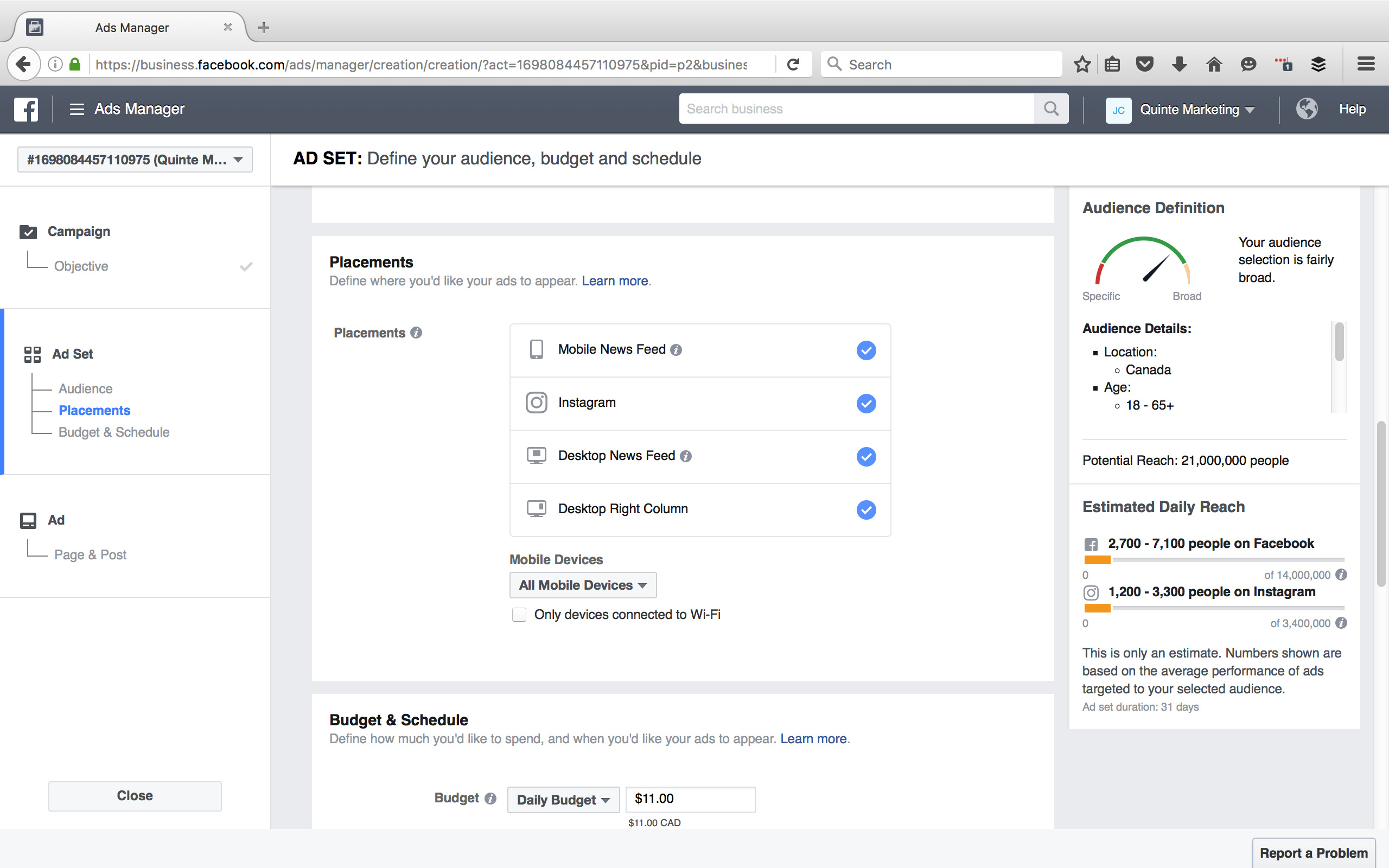 Once you have chosen the campaign type based on your objective, you will define your Ad Set. The Ad Set allows you to choose your target audience, ad placement and budget & schedule for your ad.