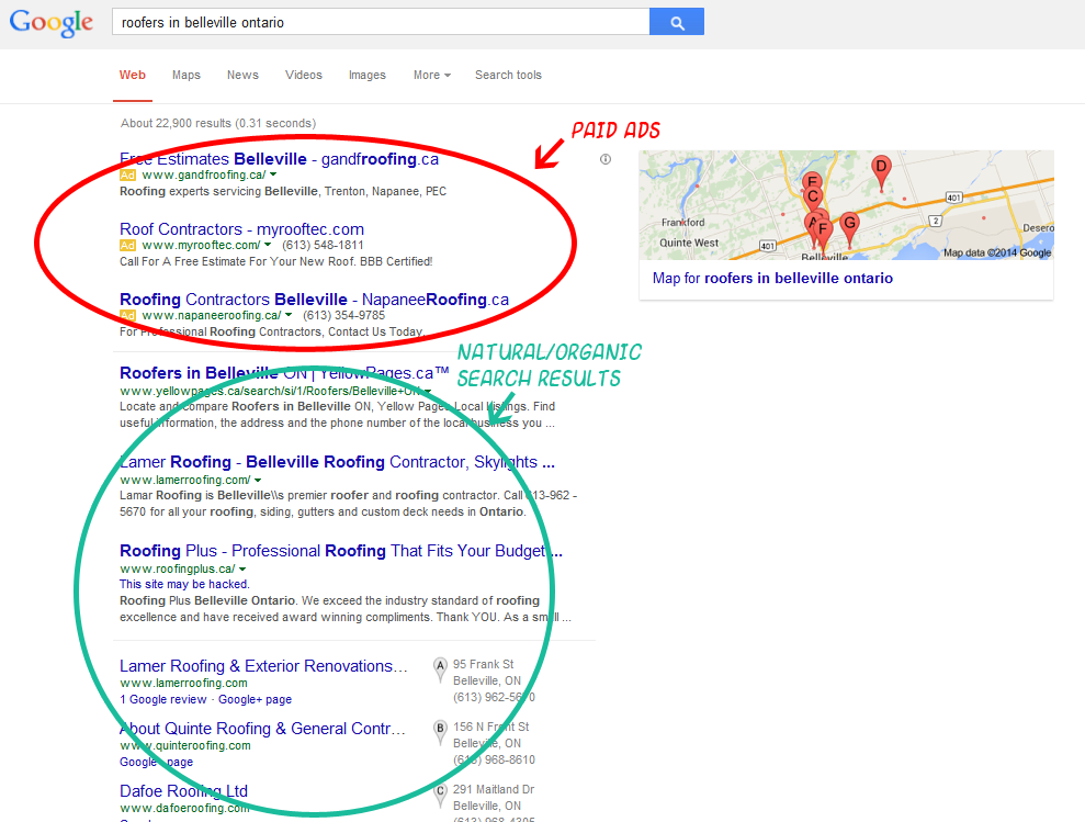 There are two ways to show up on the top of search results: Paid search (also referred to as pay-per-click (PPC), cost-per-click (CPC), Google Adwords, Search Engine Marketing) and Organic Search (also referred to as natural search, SEO or Search Engine Optimization). This article outlines the differences between the two.