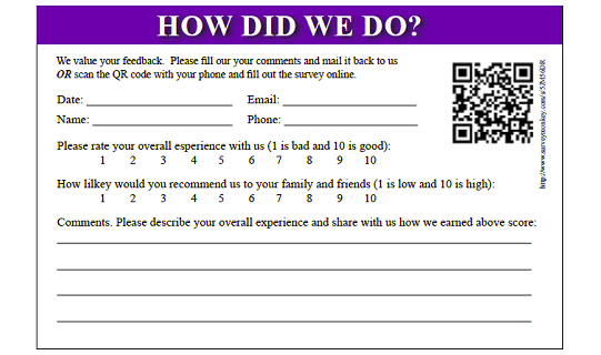 We help you collect feedback from all your customers by setting up a weekly or monthly process where we email everyone you've done business with to fill out a short survey and find out how happy they are with your service. If you don't have email addresses, we will also print out comment cards for you to hand out to your customers and get their feedback.