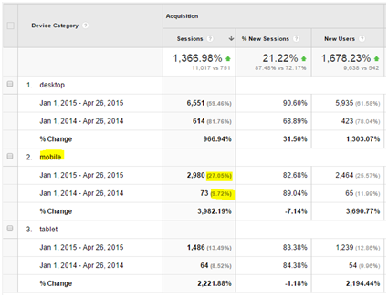 These industry statistics are supported by the website visitor reports for our clients as well. When we look at their Google Analytics reports, it is evident that there is an increasing percentage of website visits coming from mobile devices compared to previous years. Below is one such report, where mobile devices make up over 25% of visits to their website in 2015 compared to less than 10% for the same period in 2014. It is worth pointing out that this home contracting client switched to a mobile-friendly website at the beginning of 2014.